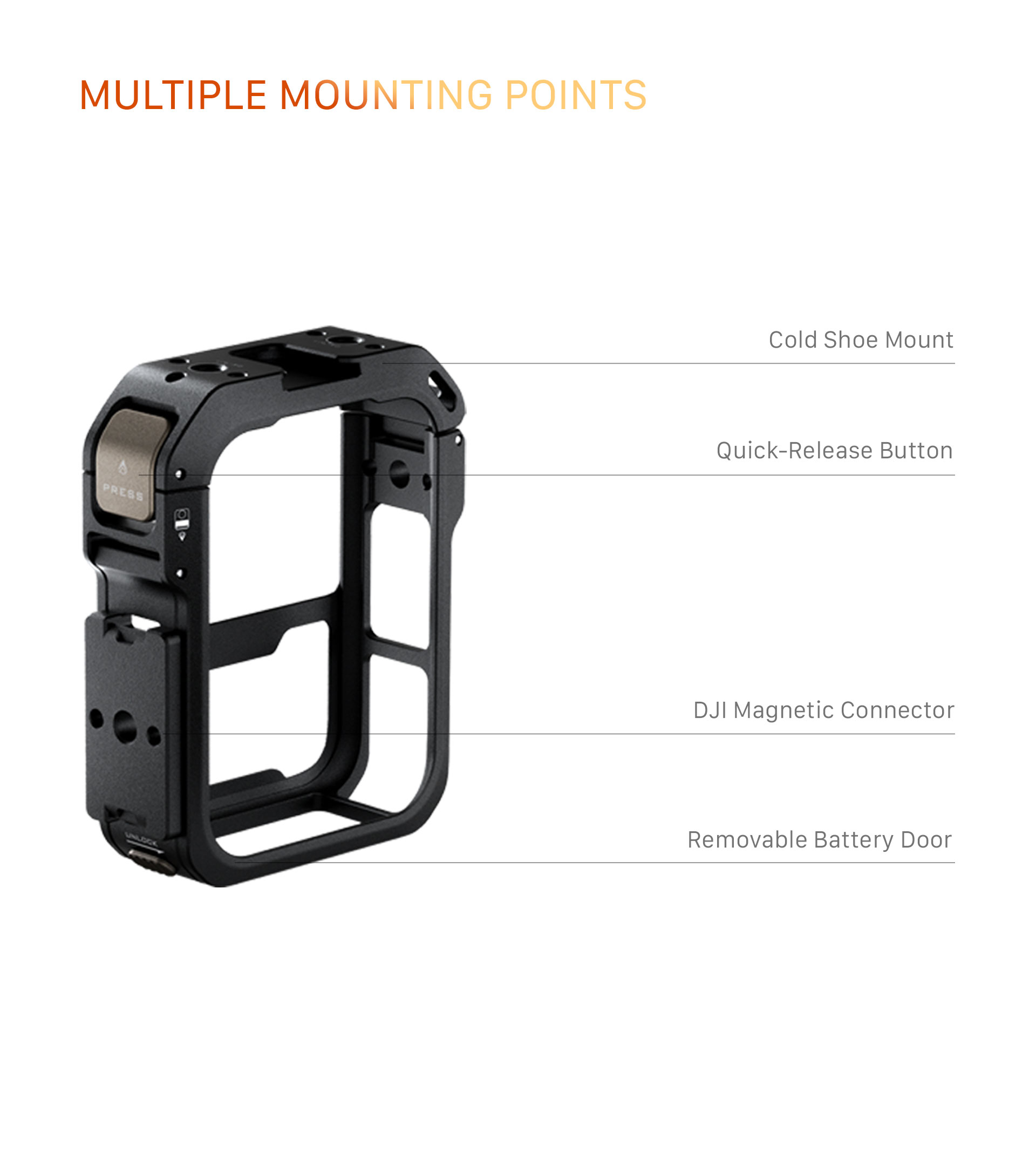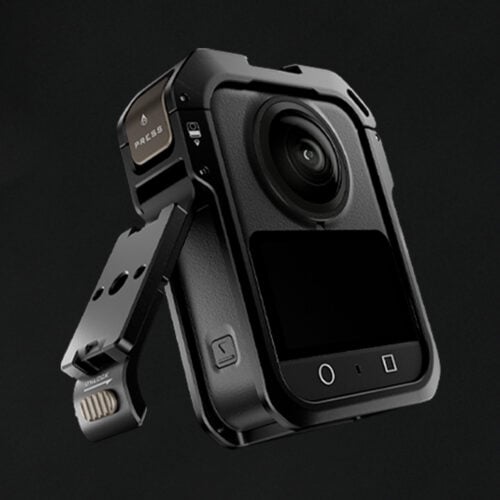This multi-functional camera cage is custom designed for the DJI Osmo 360 and supports additional accessories via mounting points such as a 1/4″-20 Thread with Locating Points, a Cold Shoe Receiver and a Strap Slot.
